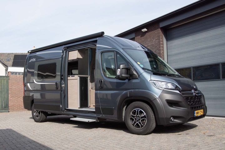 Aan de buitenkant van de camper vind je de plek waar je de schoonwatertank kunt vullen, de afvalwatertank kunt legen en het serviceluik van de toiletcassette. Aan de rechterzijde van de bus hebben we een lange Fiamma luifel gemonteerd. De zwengel hebben we praktisch voor je opgeborgen. Onze Pössl buscampers zijn verder voorzien van een Softclose sluiting voor de schuifdeur. Hierdoor maak je geen kabaal op de camping bij het sluiten van de schuifdeur. Natuurlijk heeft de Pössl ook een elektrisch uitschuifbare entreetrap.