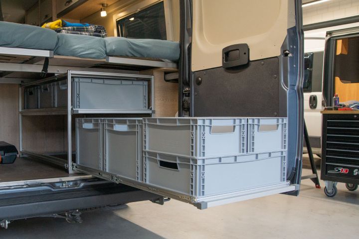 Buscampers van 6.40m lang met lengtebedden hebben een diepe 'garage'. Spullen kunnen ver onder het bed opgeborgen worden en daar kun je niet zo eenvoudig bij. Met onze pasklare ladesystemen met robuuste geleiders zijn ook de plekjes achterin gemakkelijk te bereiken en heb je altijd een opgeruimde en overzichtelijk georganiseerde bagageruimte.