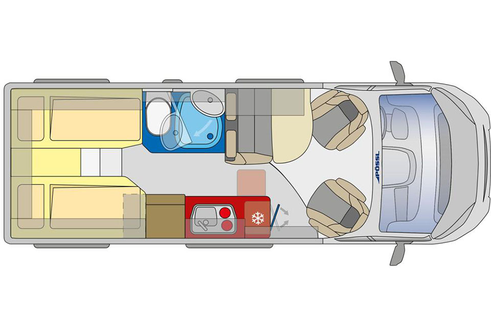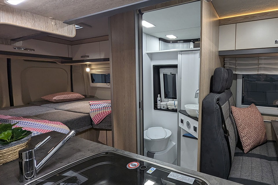De Summit 640 kenmerkt zich door de lange keuken met de Dometic koelkast bij de entree, de vlakke vloer, enkele bedden en een badkamer met het slimme 'zwenkdouche'-principe. De Summit heeft net als de Roadcruiser een ruime zitgroep, maar geeft een heel andere 'woonbeleving' door de rustige kleuren van het interieur, de volledige doorkijk tot aan de achterdeuren, het gestoffeerde plafond en de gezellige indirecte ledverlichting boven de bovenkastjes. De kraan met de hoge ovale waskom op het badkamermeubel dat bevestigd zit aan de draaibare wand, geven de Summit zelfs hotel-allure! Wist je overigens dat de toiletkom niet van kunststof maar keramisch is? Toiletcomfort zoals thuis dus in deze Summit 640!